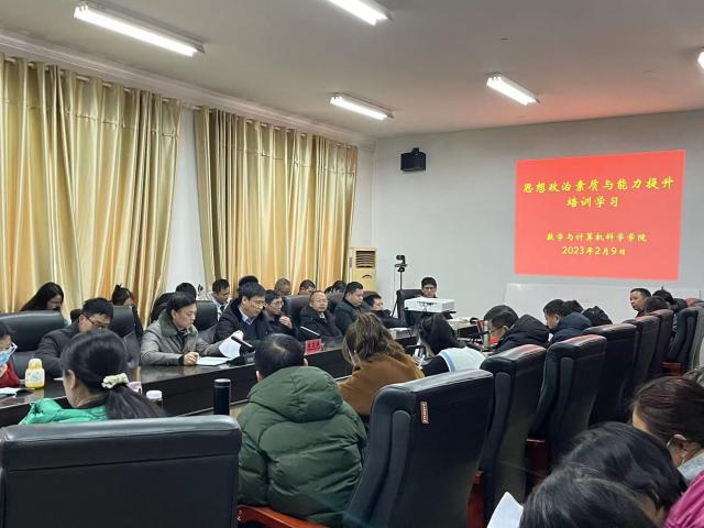 为全面贯彻落实党的二十大精神,深入学习习近平总书记关于教育的重要论述,进一步加强全体教师思想政治教育和师德师风建设,提升教师思想政治素质和职业道德水平,落实立德树人根本任务,根据校党委教师与人才工作部的部署要求,2023年2月9日上午,数计学院在红角洲校区C459会议室开展教职工思想政治素质与能力提升集中培训活动,邀请校党委委员、副校长李玉保作以《立师德强师能铸师魂》为题的师德师风专题宣讲,学院党委书记熊鹰主持,全体教职工参加。