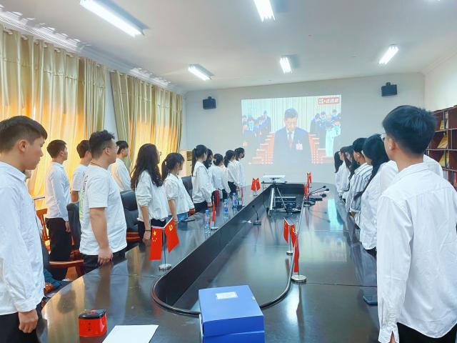 随着大会开幕,收看直播的同志们全体起立,高唱国歌。与会同志全程认真聆听习近平总书记代表第十九届中央委员会作的题为“高举中国特色社会主义伟大旗帜,全面贯彻新时代中国特色社会主义思想,弘扬伟大建党精神,自信自强、守正创新,踔厉奋发、勇毅前行,为全面建设社会主义现代化国家、全面推进中华民族伟大复兴而团结奋斗”的报告。在观看报告过程中,师生代表聚精会神、专心聆听,时而记录报告内容和心得体会,整个会场洋溢着浓厚的学习氛围,不时爆发出热烈的掌声。