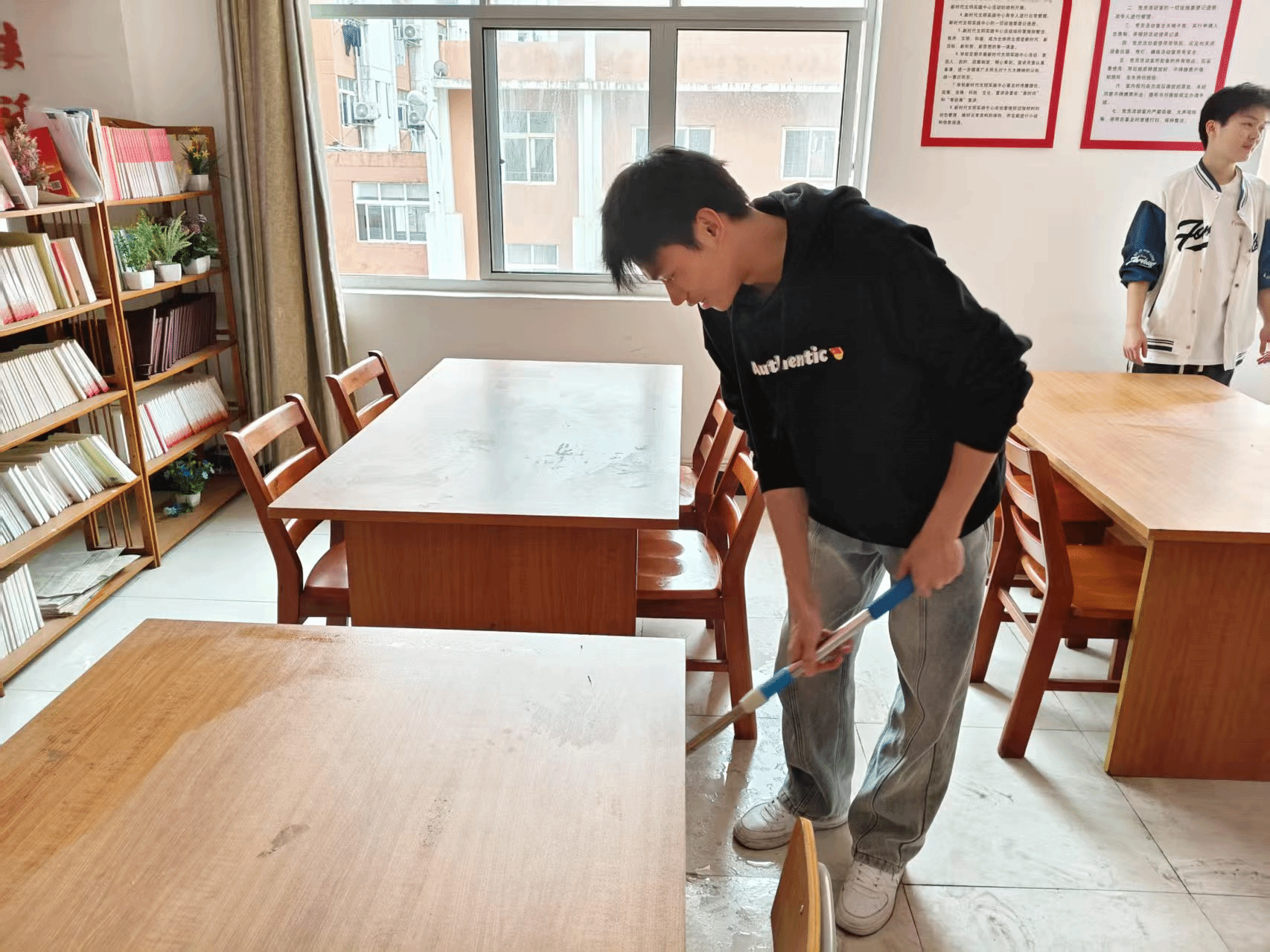 活动伊始,党、团员们分工协作,默契配合。党员带头承担重难点区域清理任务,入党积极分子细致整理公共空间,团员则负责优化细节布置书架。大家以“不留死角、不留盲区”为标准,对自习室进行全面清洁,同步更新公告信息、规整公共物品,并在书架上增设绿植点缀环境。活动结束后,六栋、十八栋自习室焕然一新,书架上分类整齐的书籍、墙上醒目的文明公约贴纸,处处彰显着党团员们的用心服务。