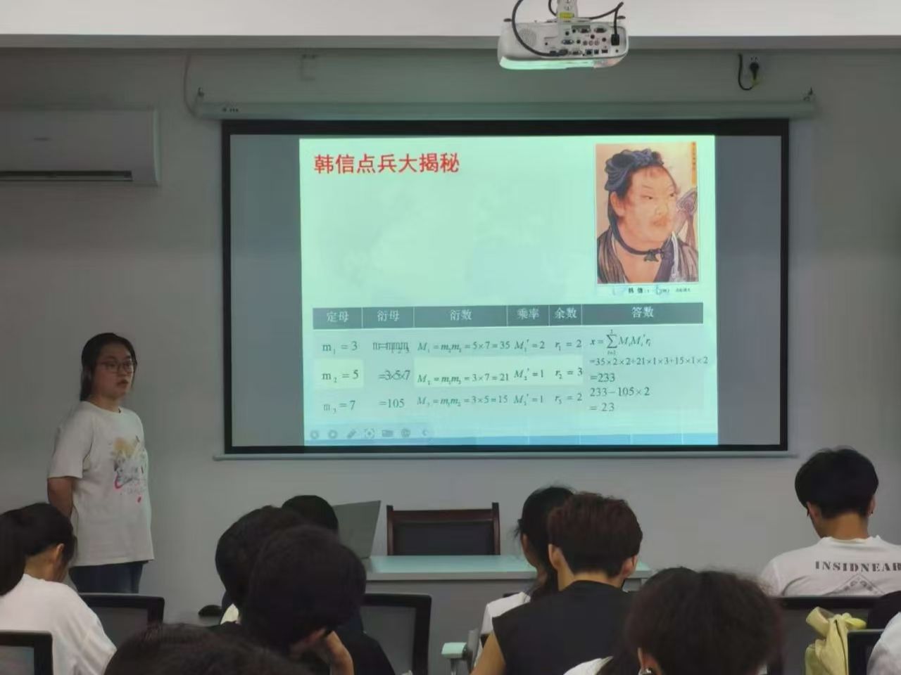 5月15日,本科生党员余菲扬在“红五星”一站式学生社区服务中心开展“数学史·中国剩余定理”专题宣讲。她以《孙子算经》经典问题开篇,系统梳理定理的历史渊源与现代应用,通过生动案例与直观讲解,将深奥理论转化为趣味知识,展现数学学科的独特魅力,激发同学们探索数学的热情。