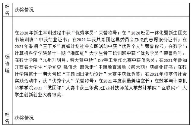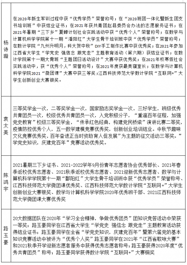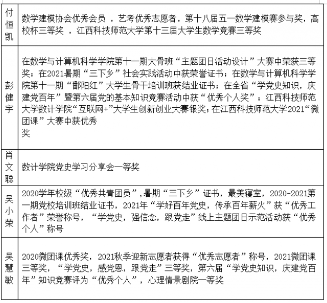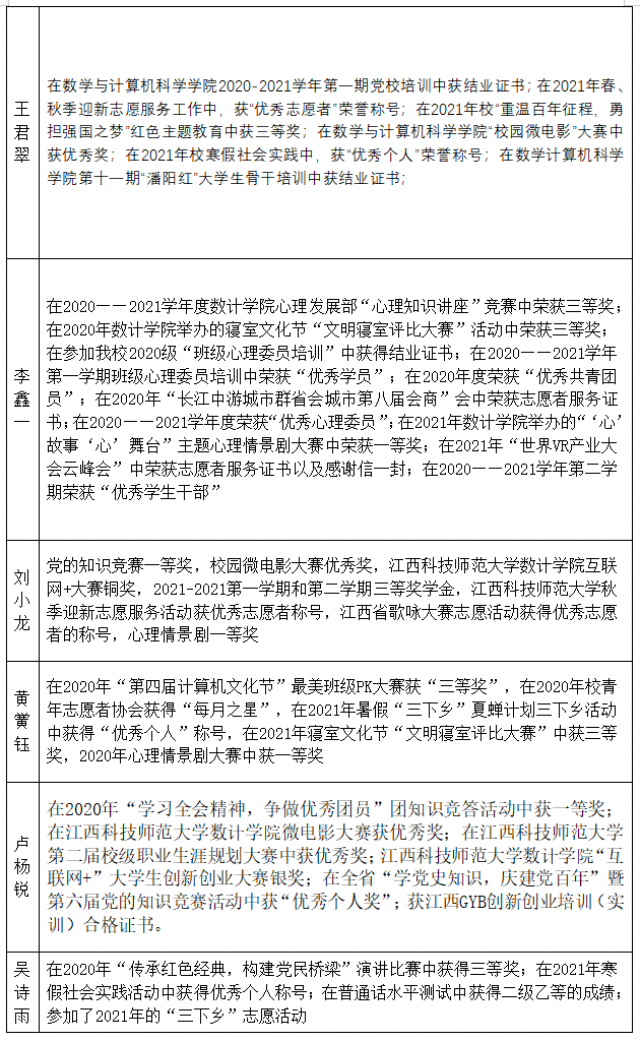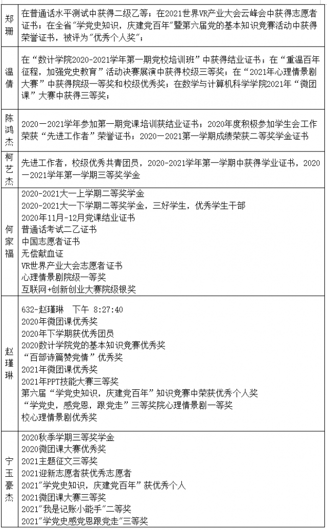 1、我团支部学风良好,在 2020-2021 学年的学习过程中取得了优异的成绩:在2020-2021 学年第一学期,陈鸿宇同学取得一等奖学金;何家福,王君翠,陈鸿杰同学取得二等奖学金;宁玉豪杰,罗妮,袁太美,刘小龙,周其然,段希玲, 柯艺杰同学取得三等奖学金。在 2020-2021 学年第二学期,王君翠同学取得一等奖学金;陈鸿宇,袁太美,何家福同学取得二等奖学金;郑俊杰,张友,吴诗雨,吴慧敏,杨诗璇,路玉豪,刘小龙同学取得三等奖学金;陈鸿宇,王君翠,何家福,袁太美同学取得三好学生;陈鸿宇,何家福同学取得优秀学生干部。
