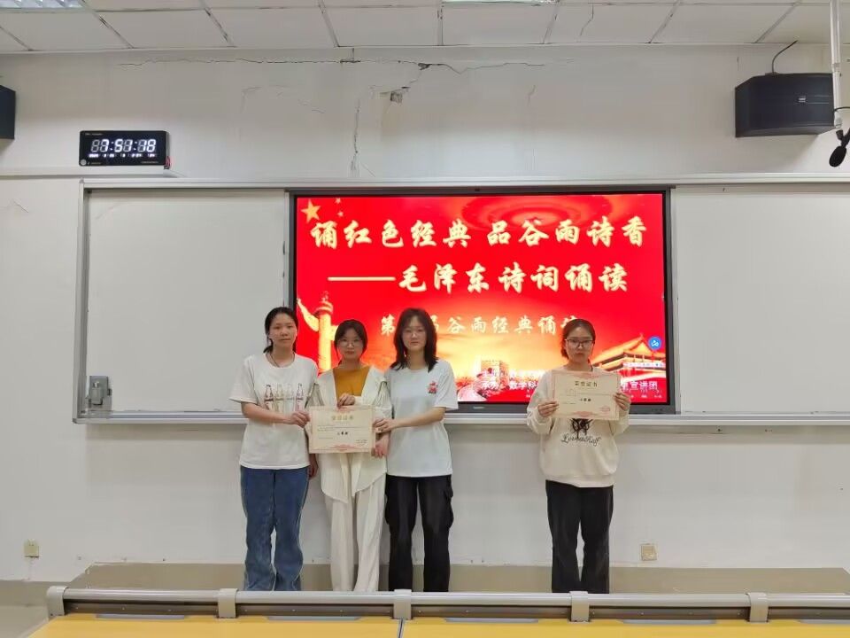 赛事现场高潮迭起,选手们以独到视角诠释毛泽东诗词等经典作品,通过或慷慨激昂、或深情婉转的演绎,生动再现红色经典的精神内核,展现新时代青年对革命文化的深刻理解与传承担当。评委组从朗诵技巧、情感传递及舞台表现等维度进行专业点评,最终评选出一等奖1名、二等奖2名、三等奖3名及优秀奖4名。