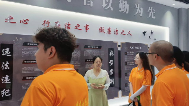 第二层为廉洁教育主题馆,分为“勤廉”“规矩”“先锋”“警钟”四个篇章。照片墙上展示了明星村历代清官廉吏的事迹,他们的形象高大而生动,用实际行动践行为人民服务的初心使命。同时村主任酒驾严重违反纪律,当地官员利用职务之便贪污腐败等反面案例让警钟长鸣。这次深刻的廉洁教育,使得“忠于人民”、“公正无私”、“清正廉洁”深深烙印在实践队队员心中。