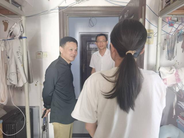 为进一步深入了解关怀学生的学习生活状态,让同学们深切感受到学院的温情与爱护,2024年6月3日下午,大数据科学学院党委书记熊鹰,党委委员、副院长刘招,学生党总支副书记朱丽,学工办副主任郑睿颖,团委副书记彭智以及专职辅导员肖城一行深入宿舍楼,走访学院6栋和18栋的学生寝室。