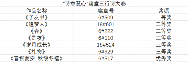 此次“诗意慧心”寝室三行诗大赛的成功举办,不仅为学生们提供了一个展示才华、交流思想的平台,也进一步锻炼了同学们的文学素养和创作能力,增进了寝室成员间的情感交流,营造更加浓厚健康的宿舍文化氛围。