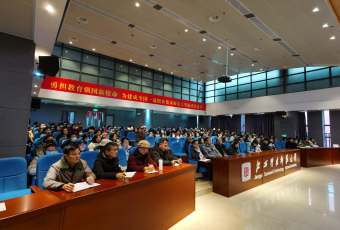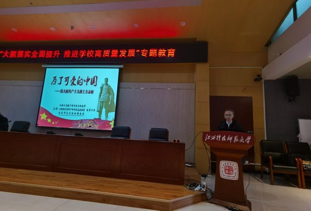 报告会由方志敏干部学院专职教师、江西经济管理干部学院客座教授、南昌师范学院特聘教授诸葛方林讲授;诸葛教授以饱含深情的语言、详实准确的史料、深厚扎实的理论,声情并茂地围绕“立志报国、革命救国、以身殉国、做方志敏式好党员好干部”四个阶段,通过播放影视资料、讲述红色故事、情景剧演绎、时空对话宣讲等方式,呈现了一堂形式新颖、内容丰富饱满的红色文化专题宣讲,再现方志敏为了民族的解放、人民的幸福“努力到死、奋斗到死”的人生历程和精神追求,引领全场在座教师回忆了方志敏同志的一生,重温了方志敏同志革命生涯,对方志敏革命精神进行了全面深刻解读,让教师们深深感受到方志敏烈士坚定的革命意志和崇高的革命精神,教师们整整齐齐坐在报告厅里,认真聆听。报告会结束阶段,在场人员全体起立,声情并茂、抑扬顿挫地集体朗诵了方志敏写的《可爱的中国》中的精彩部分。