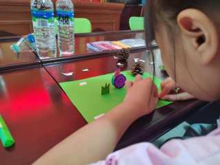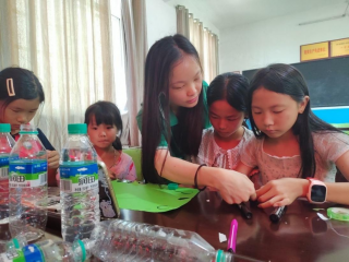 随后,实践队与当地小学生们一起将捡垃圾收集到的瓶子、纸盒、铁等废品进行“创意改造”。在实践队成员的指导下,孩子们创作出了蜗牛模型、手机支架、小汽车、立体画等手工艺品。在制作的过程中不仅废品得到了再次利用,焕发了新的生命,更提升了当地小学生的创新能力和环保意识,为构建可持续的绿色未来贡献后辈力量。