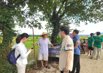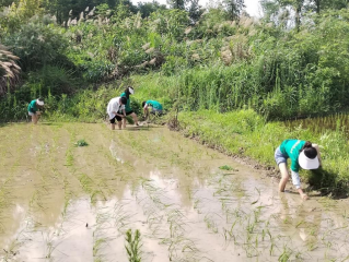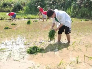 手把青秧插满田,低头便见手中天。7月6日上午,实践队下到江村田地,踏着骄阳,跟随农民来到水田,挽起衣袖,卷起裤腿,弯下腰,每人一列,有序地在田道里插秧。队员们认真聆听村民们的插秧手法和经验,转眼间空荡荡的水田换上“绿装”,阡陌交汇,青绿的秧苗随风摇曳,美丽乡村正奏响着一曲希望的歌谣,传至在场每位队员们的心里。
