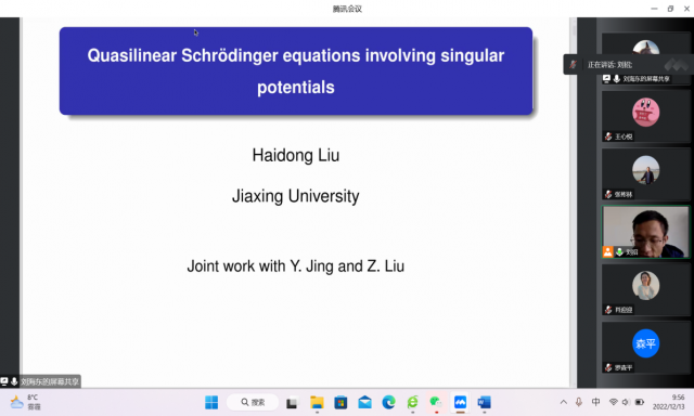 刘教授报告题目为《Quasilinear Schrodinger equations involving singular potentials》,报告介绍了关于拟线性薛定谔方程的研究背景,其中包括一些最新研究进展,并详细介绍了在满足限制条件下,拟线性薛定谔方程无穷多径向解存在性的证明过程。此外,刘教授还讨论了带有奇异位势的拟线性方程解的性质。报告结束后,刘教授就大家提出的问题给予了耐心的解答,参会师生受益匪浅。