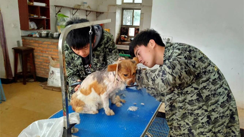 接着,志愿者们为流浪狗洗澡、喂食、药浴、剃毛等工作,在工作中了解到大部分的流浪狗都有皮肤病,更为严重的是少部分流浪狗腿有残疾,它们只能依靠工具行走,但在志愿者们的观察中,这些被救治的流浪狗都被照顾的很健康,可基地的能力毕竟有限,只能满足动物们基础的健康,即使这样,流浪动物对基地以及志愿者们还是有很大的热情。