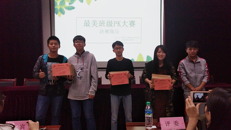 决赛现场,每组参赛选手按顺序依次上台对各自的作品进行讲解。各自从自己班级的特点出发,设计出具有自己班级特色的班徽。参赛选手借助精美的PPT展示,详细讲解了班徽的设计灵感、代表意义及设计过程。各班的班级视频各具风格,内容颇为丰富。有的选手在展示过程中话语幽默,令人捧腹大笑;有的选手则以独特的风格吸引观众的眼球,赢得大家热烈的掌声。经过紧张激烈的角逐,由评委进行公正的评定,根据最后得分评选出获奖作品。其中,16数学1班、17数学2班、16软件2班在本次比赛中脱颖而出,他们以独具风格的班徽作品,通过精美赏心的图案设计和颜色搭配展现班级个性风采,包括具有生活色彩的视频荣获本次比赛一等奖。最后由评委为获奖选手颁发证书及奖品,本次比赛在获奖选手合影留念后圆满结束。