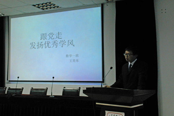 为了积极引导广大学生发扬党的优良作风,展现学院学生奋发向上,努力拼搏的良好精神风貌,树立正确的人生观、价值观,数计学院党总支11月3日下午1:50在我校红角洲校区2305学术报告厅成功举办“加强党风建设·树立优良学风”演讲比赛。此次大赛邀请了学院党委书记陈洪琪、学工办主任范严、学生党支部副书记朱丽、辅导员郑睿颖、刘兴担任此次大赛评委。自初赛中脱颖而出的16名参赛选手参加本次演讲大赛决赛。大赛在主持人的开场白下拉开序幕。
