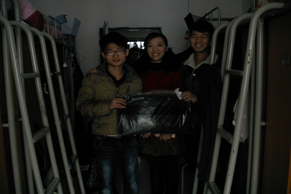 值此寒冷天气,学院领导在学生干部的陪同下来到学生寝室。在寝室里,领导老师们先唠家常似的交流谈话,随后将学校专门按个人身高体重购买的棉衣或棉被亲手赠给学生。同学们纷纷感谢学校一直以来的关心,备受感动,纷纷表示会努力读书、踏实做人,用实际行动取得好成绩,回报学校的关爱。