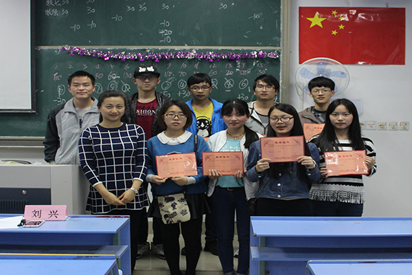 经过一个星期的努力拼搏,留下的精英队伍终于迎来了趣味数学决赛。协会各部员安排参赛选手按组入座,一切准备就绪后,黄丙璋宣布大赛正式开始。各组成员热情高涨,斗志十足。比赛分为四个流程,第一轮是必答题,这既考验了选手们的空间思维能力,也考察了他们平时的口头表达能力,接下来是互动环节,各参赛人员围成一个大圈,通过报数来考察同学的反应能力,反应慢的淘汰出局,第三轮是抢答题,各参赛组要在规定的时间内抢答各种题型,选手们沉着冷静,在有限的时间内快速运转大脑,争分夺秒抢答各种难题。接着是风险题和加赛题,针对那些成绩不分上下的参赛组,最后环节是揭晓答案的时刻,主持人依次宣布比赛获奖组及成员。最后,刘兴老师为参赛选手颁发奖状和奖品并合影留念,为这一周的奋斗画上圆满的句号。