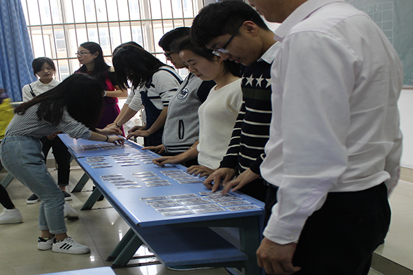 讲座伊始,张贤宏先用了短暂的时间来讲述自己的故事,随后,张贤宏表明接下来我们会进行一场竞争性的游戏,将在场的所有成员分成五个小队,并说明了游戏规则。游戏第一回合进展得不是很顺利,大家毫无默契程度,只有靠运气。第一回合结束后,根据第一回合的比赛数据,张贤宏先让每个小队的队长回答自己小队的有点以及不足。随后,张贤宏在黑板上写出“聆听”,并说:“这是大家都忽略的观点,也是最重要的一点,如果大家聆听一下你的队友翻过的牌,犯过的错误,后面的队员就不会再重蹈覆辙。”之后比赛继续进行,大家也都沉浸其中,时间过得很快,五轮比赛很快就结束了,每一轮的结束,张贤宏都会给予我们不一样的感悟与体验