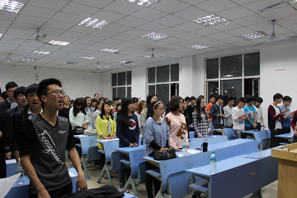 小教练们按大家声部的不同分出男高音、男中(低)音、女高音、女中(低)音四个声部,每个声部在不同的教室练习。辛苦练习与教练的倾力教导,大家都渐渐掌握自己所负责的演唱部分,虽然仍有个别地方微有瑕疵,但合唱成员们都表示能改正克服。每次排练,大家也都早早的赶到练习室,甚至有的人将晚餐时间推向了九点,只为和大家一起不断地练声、唱曲,大家从不熟悉歌曲到牢记每一句歌词都付出了大量的时间和精力,力将团队的合唱效果达到最佳。学员们每天“听”到自己的进步,心中感到更多的还是成就感和快乐。排练期间,学生会主席及各部门部长不定期到现场观看慰问,鼓励大家!