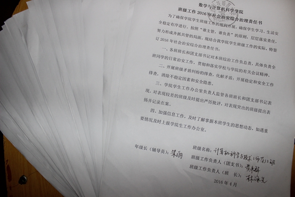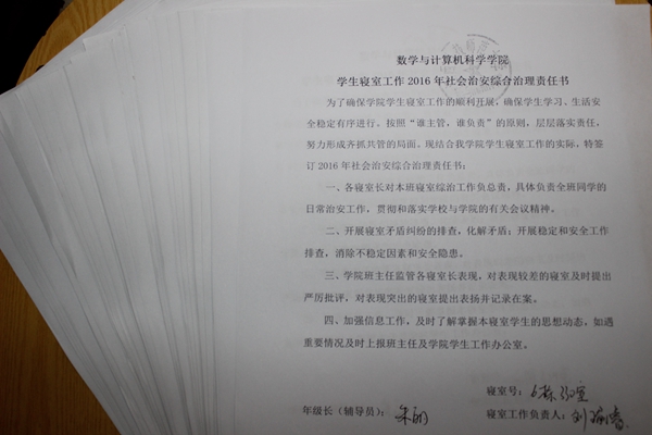 为贯彻落实我校2016年社会治安综合治理管理工作要求,切实做好校园安全稳定各项工作,数计学院综治部组织学院大一大二各班级和宿舍签订了2016年社会治安综合治理责任书。