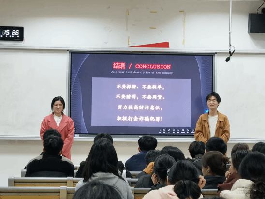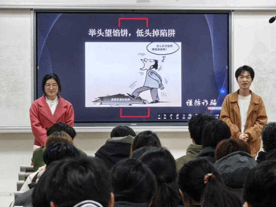 活动现场采用“案例解析+情景模拟”创新模式,针对大学生群体揭露三大新型诈骗陷阱:以“零门槛兼职”“免费教育基金”诱导的贷款诈骗,利用AI换脸技术伪装的“杀猪盘”情感诈骗,以及虚构商品诱骗私下交易的盲盒诈骗。通过展示犯罪心理学“三步攻心术”模型,重点剖析“贪、恐、情”三大心理弱点,警示学生警惕“轻松赚大钱”“免费领福利”等话术陷阱。随后,宣讲团推出“反诈三件套”实用指南:求职前通过“天眼查”核查企业资质,交易时使用正规支付平台并留存凭证,全员安装“国家反诈中心”APP并开启预警功能,帮助学生构建系统防范思维。