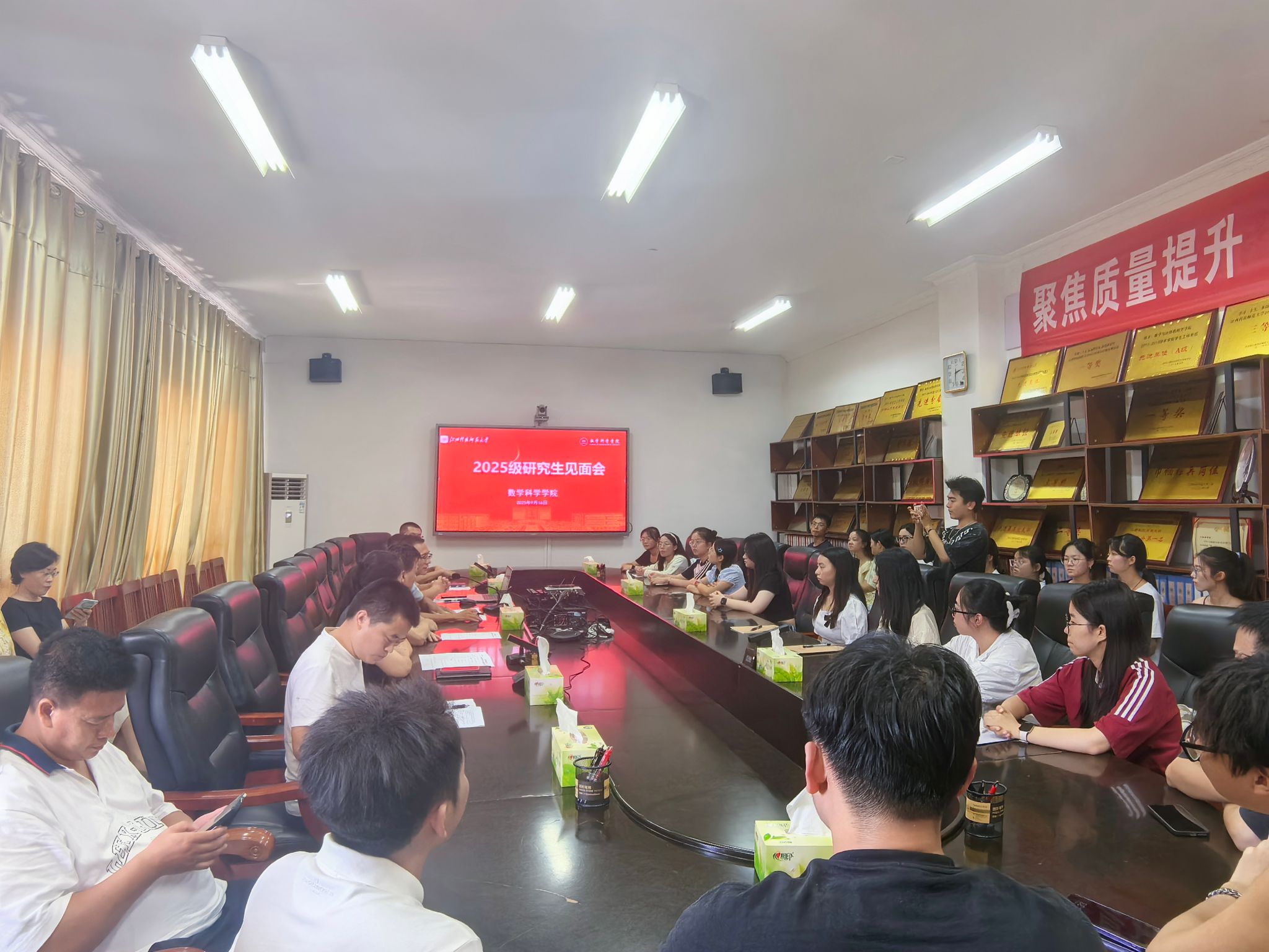 会上,副院长(主持行政工作)刘招首先代表学院致欢迎辞,并详细介绍了学院的发展历程、学科建设、师资队伍、科研成果及人才培养等方面的情况,展现了学院坚实的学术基础和强大的办学实力。在硕士点介绍环节,一级学科数学负责人张文锋教授系统阐述了数学学科的研究方向、师资配置及培养方案;学科教学(数学)负责人林子植副教授则重点介绍了该专业的特色定位、课程体系及实践平台。学院党委书记熊鹰作总结讲话。他勉励新生树立远大志向,积极投身学术研究,并表示学校在申报博士点工作中的坚定决心和战略布局,希望新生们能够与学院共同成长、共创未来。