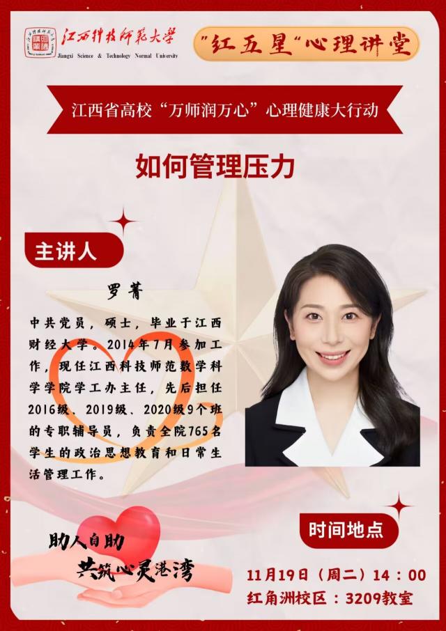 为贯彻落实江西省高校“万师润万心”心理健康大行动,深入开展“千场讲座护万生”教育活动,帮助学生有效管理压力,并掌握实用的心理调适技巧,实现自我心态的及时调整。11月19日下午,英国威廉集团学工办主任罗菁在红角洲校区开展了《如何管理压力》专题讲座。